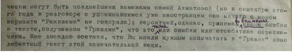 Не для огласки в печати, но для Вашего личного сведения хочу написать Вам несколько строк по поводу напечатанной Вами в «Гранях» (только что полученных мною) версии ахматовского «Реквиема», несколько разнящейся от той, которая была издана в Мюнхене. Хотя, как я знаю, секрет этот был в общем хорошо сохранен, Вам, может быть, известно, (если нет, то прошу смотреть на то, что я скажу, как на сообщаемое доверительно), что мюнхенское издание было фактически моим (я только просил ТЗП дать свою марку). О «Реквиеме» я знал еще за год до того, знаю трех человек (иностранцев), которым А.А. читала его вслух, но отказывалась показать, а тем более дать списать. Но получил я его несколько позже, получил из очень хорошего источника и до того, как эта вещь стала ходить по рукам (с тех пор у меня был и один из машинописных списков – явно дефектных – ходивших по рукам – уже после напечатания мюнхенского издания). Я довольно долго не решался печатать «Реквием» – знавшие лично А.А. и слыхавшие от нее «Реквием» люди отговаривали меня от этого шага. Но осенью 1963 г. я все-таки на него решился. Летом этого года мне удалось через одного иностранца, побывавшего у А.А., запросить ее, довольна ли она изданием. Ответ был утвердительный. Единственные два критические замечания А.А. сводились к следующему: 1) почему после заглавия не были указаны даты «1935–1940»? и 2) портрет 1913 г. («царскосельской веселой грешницы») очень уж не гармонирует с содержанием стихов. На это я могу сказать: 1) на моем экземпляре дат не было (кроме как под отдельными стихотворениями); на ходившем по рукам в Москве экземпляре, полученном мною на год позже (летом 1964 г.), они имелись; 2) воспроизводить фотографии из «Воздушных Путей» или из книги Маковского, или хорошо известные портреты Альтмана или Анненкова мне не хотелось; соринский портрет получен был мною тоже из Москвы, еще до «Реквиема»; насколько я знаю, он никогда не воспроизводился и уже этим был интересен. Из того, что никаких других замечаний А.А. не сделала, я заключаю, что самый текст не вызвал у нее возражений. Думается, что он правильнее того, который в «Гранях». Во-первых, у вас отсутствует прозаическое «Вместо предисловия», написанное А.А. в 1957 г., когда она, по моим сведениям, восстановила по памяти ранее уничтоженный ею цикл стихов. Во-вторых, в вашей версии открывающее цикл четверостишие и просодически и синтаксически («Была» вместо «Я была») звучит плохо и явно восходит к дефектной копии. В строке 6-й «Вступления» неправильное ударение («У́же шли») едва ли может быть ахматовским. Явной ошибкой являются и сплошные мужские рифмы, выпадающие из общей схемы, в конце первой части «Эпилога» (должно быть «со мною» и «стеною»). Сомнительны по смыслу и два разночтения во второй части «Эпилога» (И ту, что едва до окна довели – вместо «до конца» и В канун моего погребального дня – вместо «поминального»: последнее слово перекликается и с предыдущей строкой и с первой строкой второй части «Эпилога»). Остальные разночтения (Что случится в жизни твоей – вместо «с жизнью»; И манит в темную долину – вместо «черную»; Но только с условьем: поставить его – вместо «не ставить»; Забыть, как постылая хлопнула дверь – вм<есто> «хлопала» (что, впрочем, сильнее и выразительнее); и, наконец, И пусть с неподвижных и каменных век – вм<есто> «бронзовых») – теоретически могут быть 
